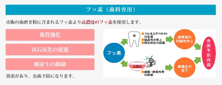 市販の歯磨き粉に含まれるフッ素より高濃度のフッ素を使用します。そのため、